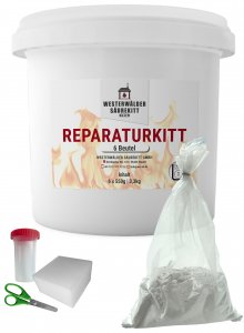 REPARATURKITT UNIVERSALReparatur LösungFür die Behebung von Schäden und zur Ausbesserung praktisch verpackt in 6 separaten Spritzbeuteln. Nach dem Mischen und Kneten direkt anwendbar. Hitzebeständig bis 1000 °C Gebindegröße: 6 x 550 g, Das Reparaturset enthält neben den 6 Beuteln Bindemittel auch 1 Messbecher, 1 Schere und 1 Schwamm zum Auftragen und Verblenden. |