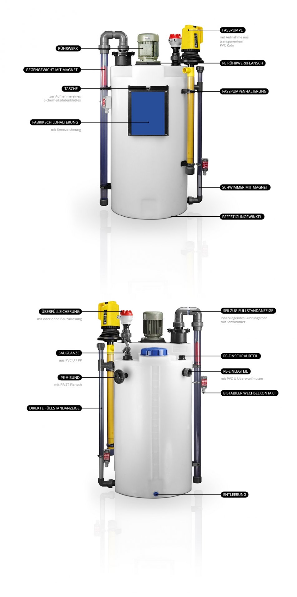 Die eingeformte Literskala der Dosierbehälter, ermöglicht das Ablesen des Füllstandes und die Flachstellen die Montage von Armaturen und Behälterdurchführungen. Bei der Aufstellung der Dosierbehälter mit Rührwerken, werden im unteren Bereich Befestigungswinkel integriert, damit das Wandern des Dosierbehälter verhindert wird.