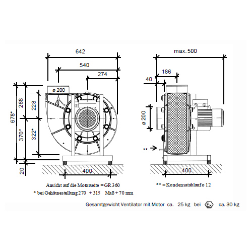 Direktgetriebener Radialventilator zur Förderung aggressiver und explosionsfähiger Gase, Temperatur max 40°C Ventilator II 3G c IIB T3 X 05 ATEX D085 Gehäuse aus PPs, in gespritzter Ausführung mit integrierten Dichtungssystem, bestehend aus Kondensatwehr als umlaufende Tropfkante und einer Labyrinthdichtung, mit zusätzlicher Fettsperre, von aussen nachfüllbar, und Lippendichtung, Kondensatablaufstutzen an der tiefsten Gehäusestellung Laufrad mit rückwärtsgekrümmten Schaufeln aus PPs, in gespritzter Ausführung mit Rückenbeschaufelung für garantierten Unterdruck an der Wellendurchführung im Betrieb, Gehäusestellung GR, Ausblasrichtung 45° / 90° / 135° / 180° / 270° / 315° /360° Grundrahmen: Stahl-verzinkt Antrieb : Normmotor ATEX- konform EEx e II 2G T3 3 x 230/400V, 50 Hz, IP55, Wärmeklasse F, Zubehör : Gummi -Schwingungsdämpfer saug- und druckseitige Schutzgitter sind bauseitige Leistung durch Kunden Volumenstrom m3/h 300 - 3430 Druckdifferenz PA 1760 - 640 EEx e II T3 Polzahl 2 Sync. Drehzahl bei 50 Hz 3000 1/min Motorleistung kW 1,1 Nennstrom bei 400 V 2,6 A Baugröße 80 Bauart B5 / IP55 |