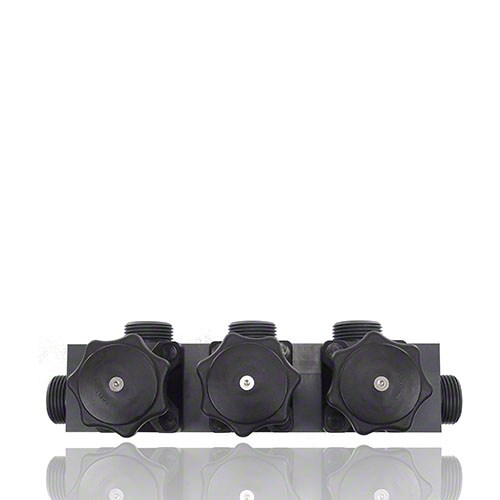Mehrwegeventil aus ABS mit drei Handantrieben, Abgang reduziert, Membrane PTFE