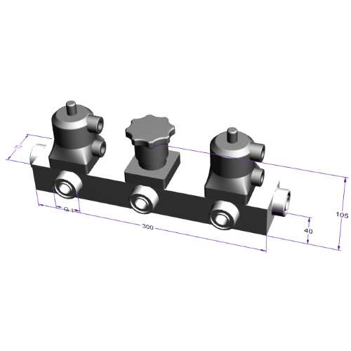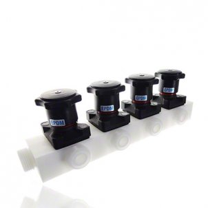 Mehrwegeventil in Blockbauweise aus PE ausgerüstet mit: - Kunststoff-Handantriebe vom Typ 286 inkl. einstellbarer Schließbegrenzung - Membrane PTFE - Anschluss Außengewinde mit O-Ring FPM, handelsüblicher PP Überwurfmutter mit Einlegeteil zum Stumpfschweißen - Betriebsdruck max. PN 6, einseitig anstehend Der dargestellte Verteiler, stellt nur eine mögliche Ausführung dar. Es besteht die Möglichkeit, den Block mit Pneumatik-Antrieben entsprechend auszurüsten. Mögliche Bohrungen zur Einbringung von Messstellen, wie z.B. PH, REDOX oder Temperatur sind ebenso möglich, wie die Reduzierung des Abgangs, bzw. des Durchgangs. Die Anschlüsse können sowohl als Gewinde, Flansch oder in anderen Ausführungen dargestellt werden. Anmerkung: die abgebildete Ausführung ist ohne handelsübliche PP Überwurfmutter mit Einlegeteil dargestellt. Die in der Zeichnung dargestellte Kombination mit einem Automatikantrieb, zeigt eine weitere Kombinationsmöglichkeit. |