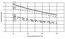 Innendruckbelastbarkeit von unverstärkten Sattel-T-Stücken aus PE 100 SDR 17Werte gelten für Wasser von 20°C; Standzeit 25 Jahre und einem Sicherheitsfaktor von 1,6 Grundrohr- und Abgangsstutzen-Maße in mm Druckangaben in bar |